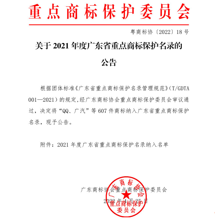 据悉,广东省重点商标保护名录,是由广东商标协会重点商标保护委员会建立的保护名录,对享有较高知名度、具有较大市场影响力、容易被侵权假冒、确需加强保护的注册商标及时纳入名录予以保护,有利于打击商标侵权行为,为品牌建设工作提供有力保障。此次“乐鱼体育 SSWW”入选保护名录,也彰显了乐鱼体育下载app官网的品牌知名度和市场影响力,通过合法途径保护知识产权的方式,为打击商标侵权行为、维护消费者与合作伙伴权益提供了强而有力的保障!