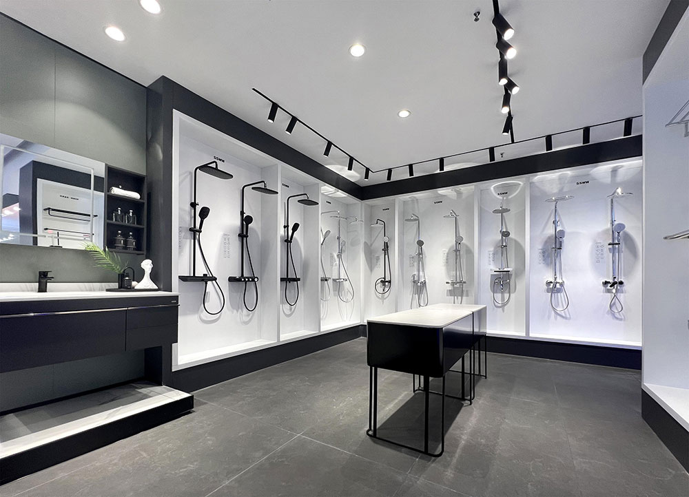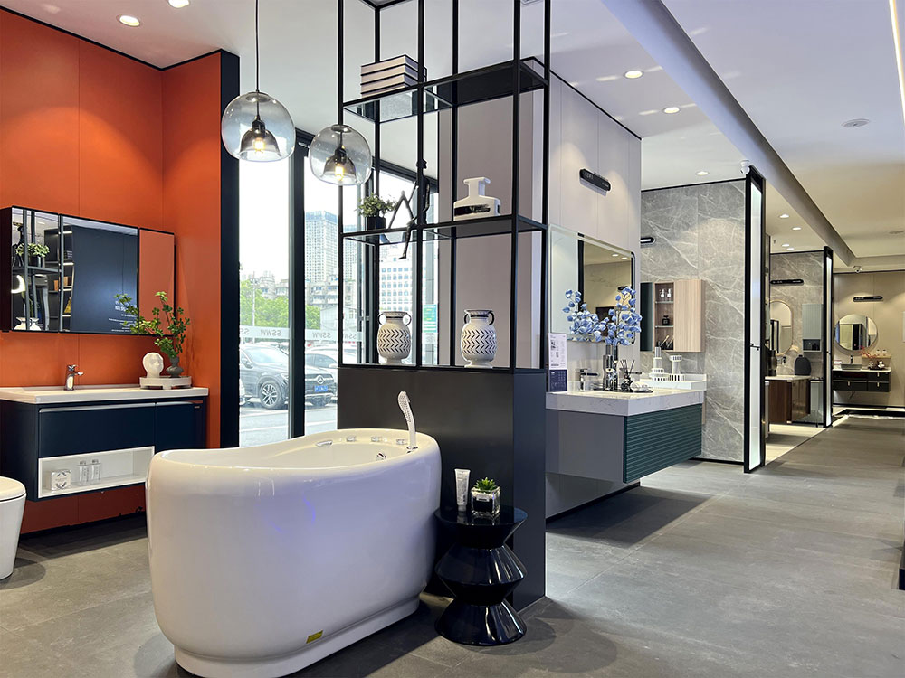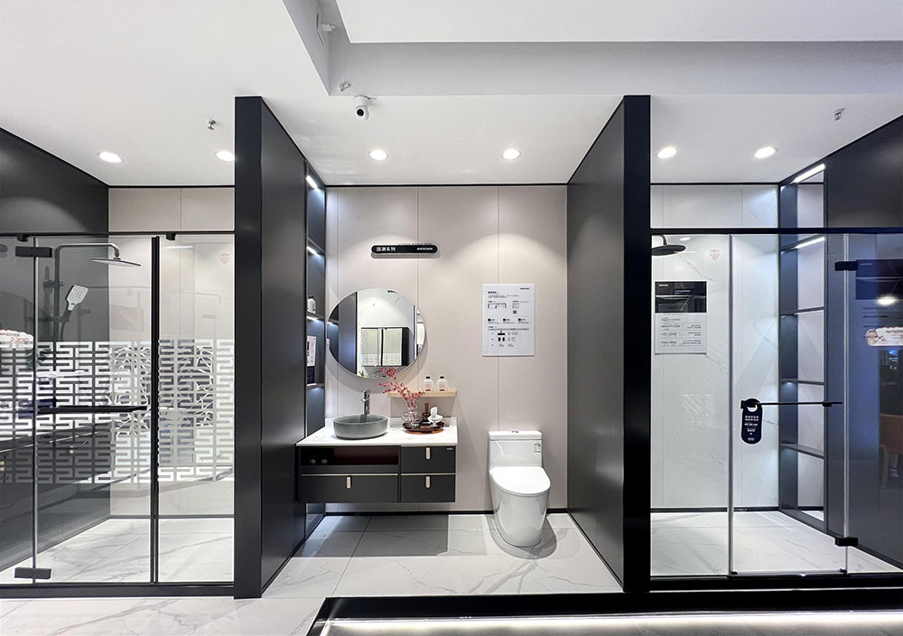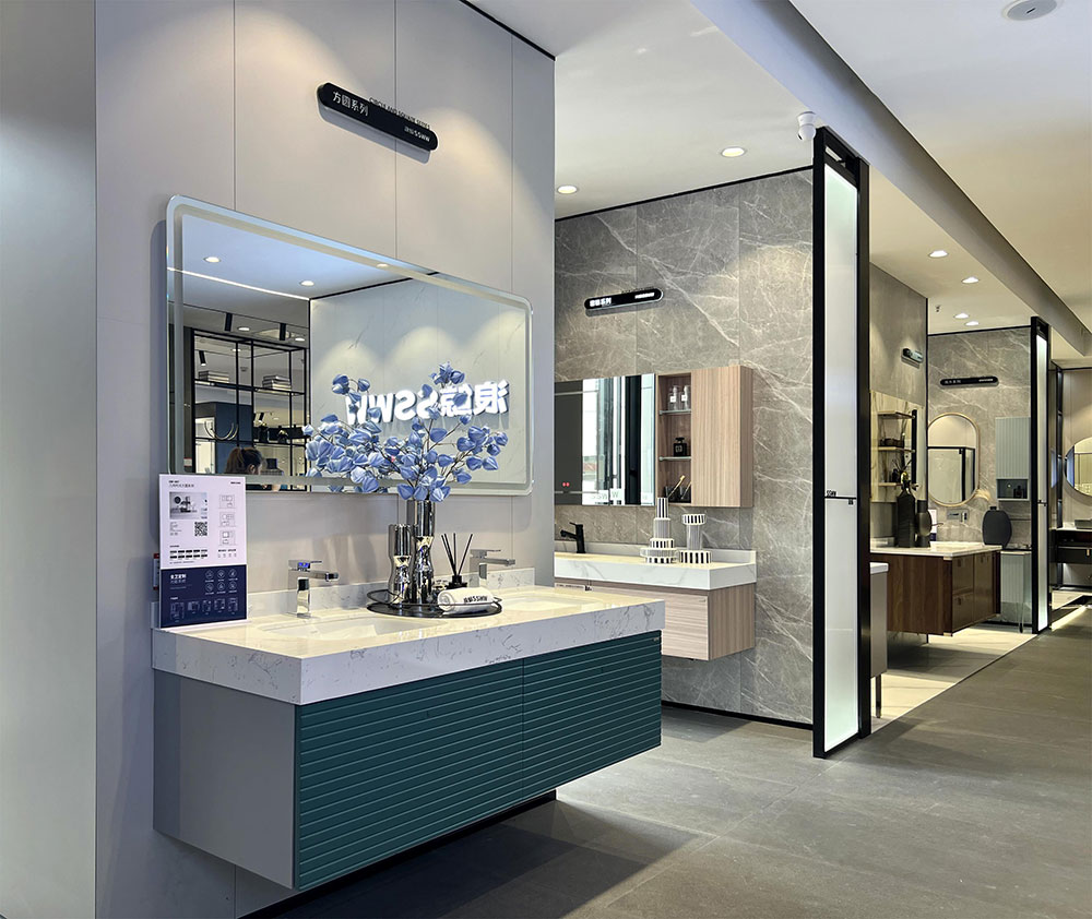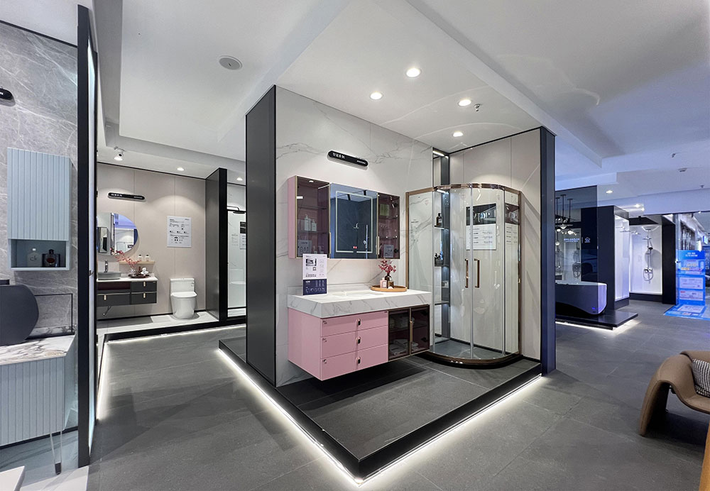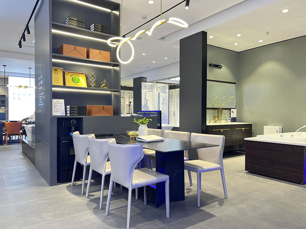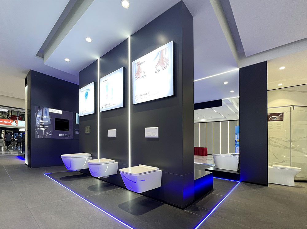 店内将乐鱼体育产品进行分区展示,智能区、五金区、浴室柜区等有序划分,产品款式多样,不同区域产品墙上也对应的将产品性能以画面或文字的形式进行阐述,既还原了产品的特性,又能很好的满足消费者的观赏与选品。