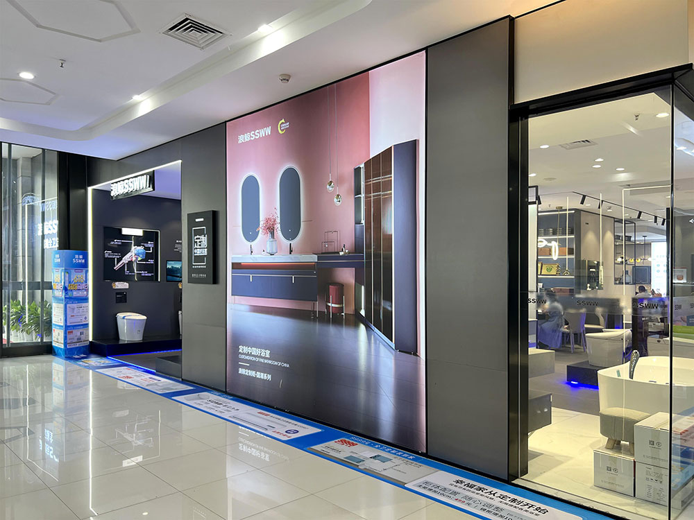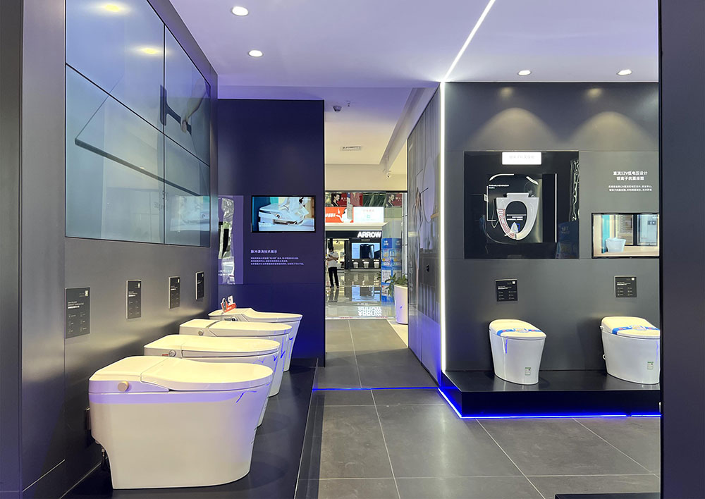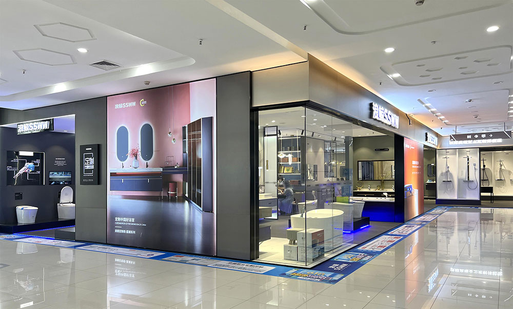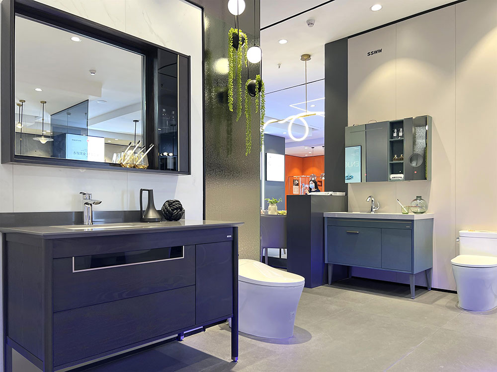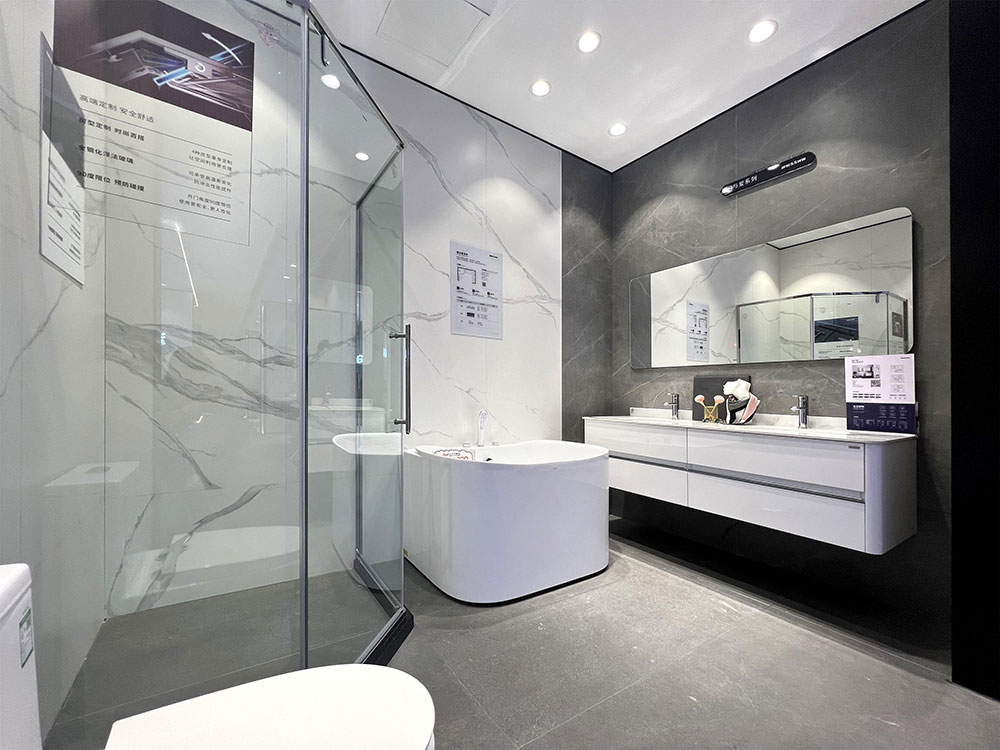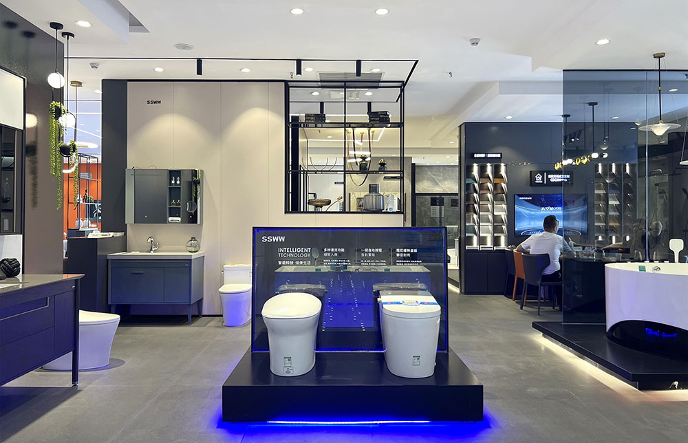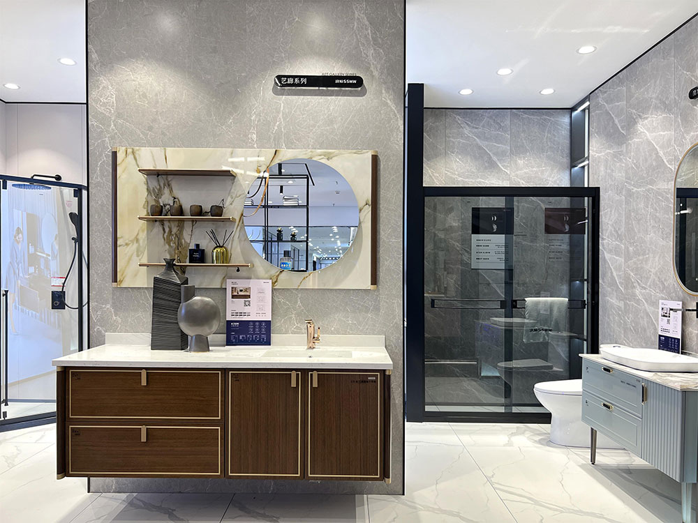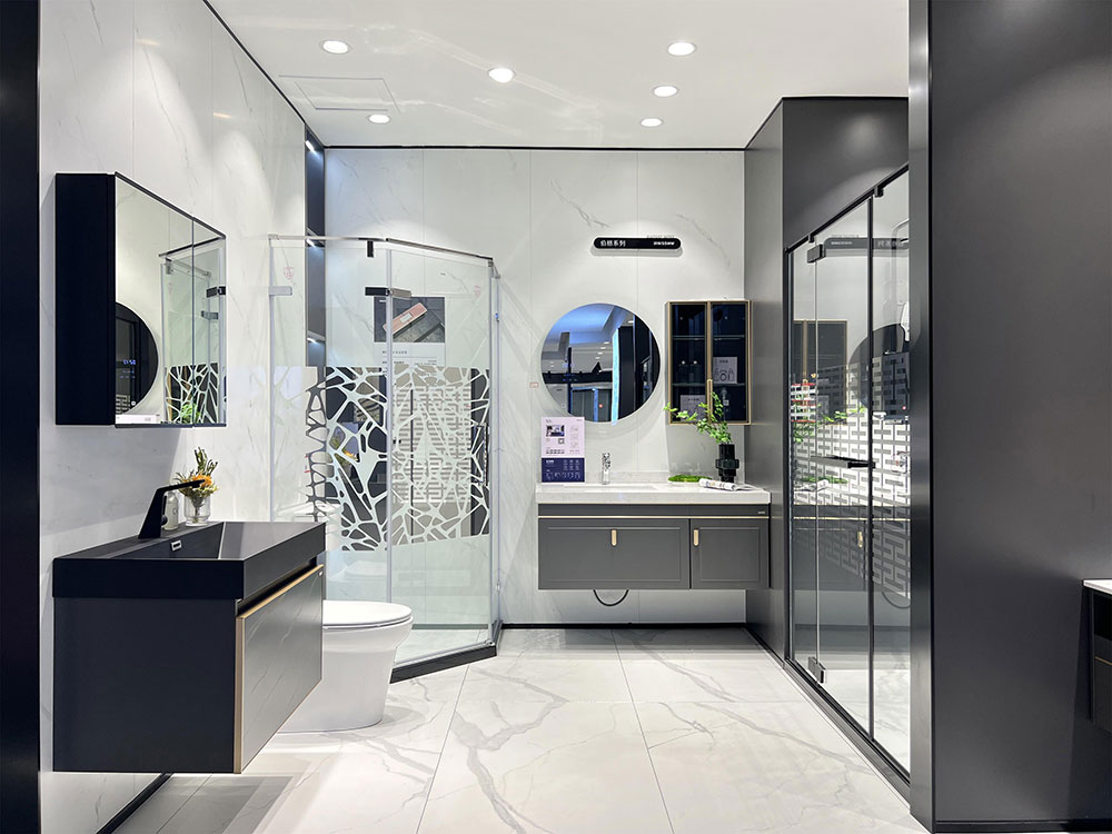 店内将乐鱼体育产品进行分区展示,智能区、五金区、浴室柜区等有序划分,产品款式多样,不同区域产品墙上也对应的将产品性能以画面或文字的形式进行阐述,既还原了产品的特性,又能很好的满足消费者的观赏与选品。