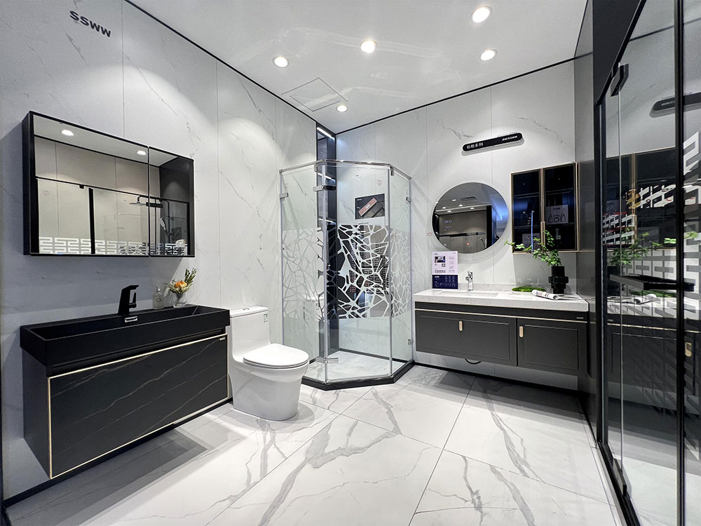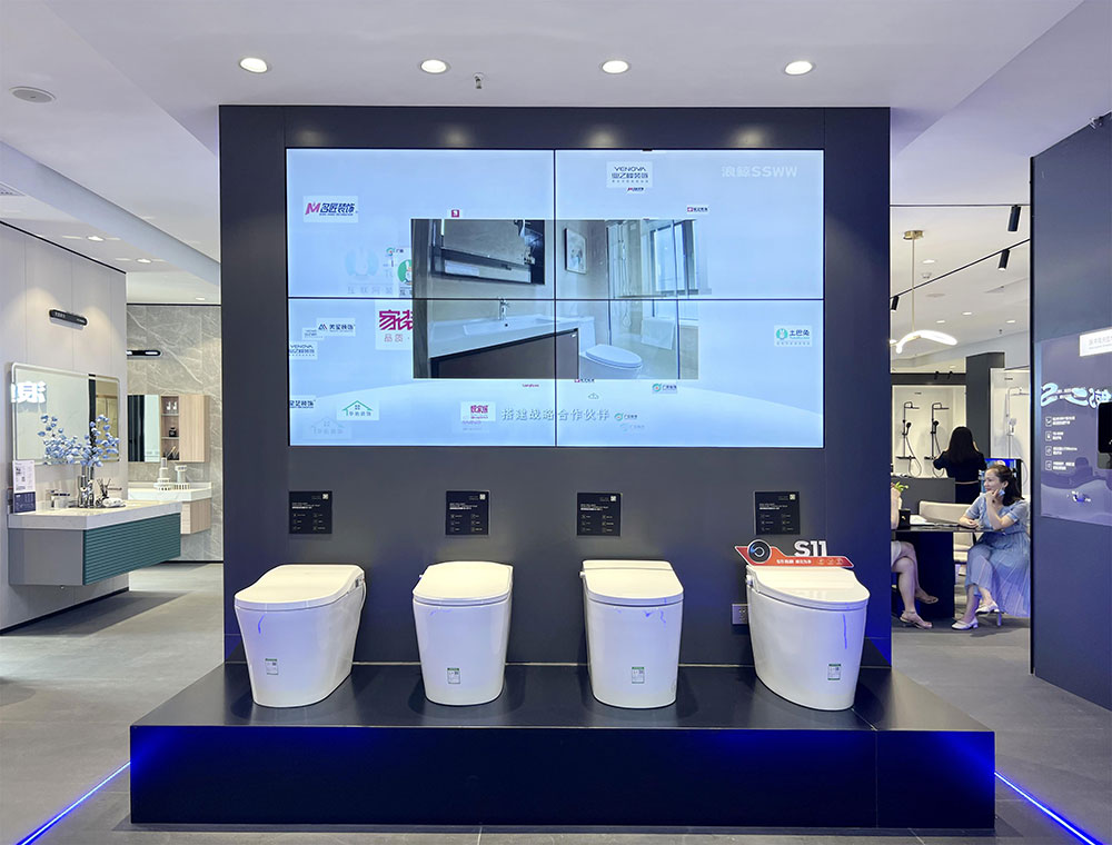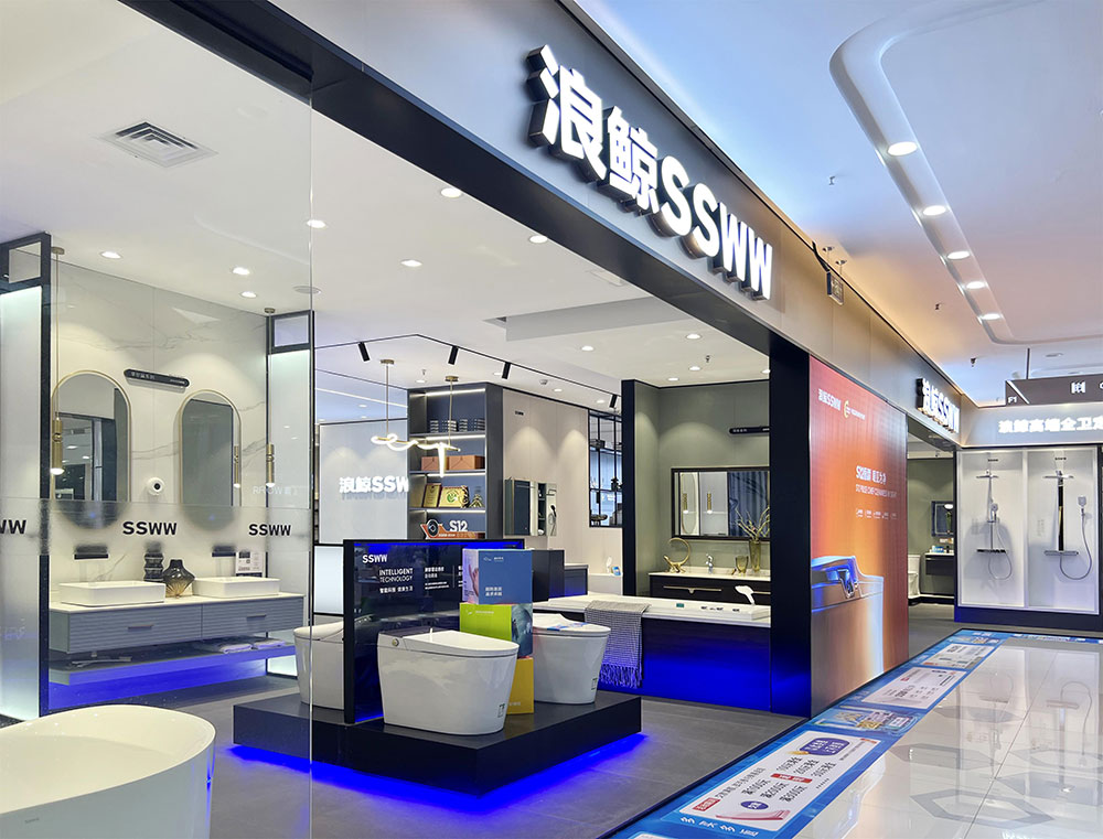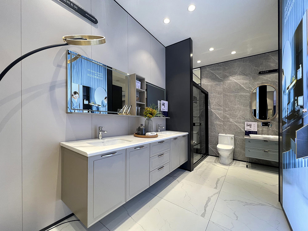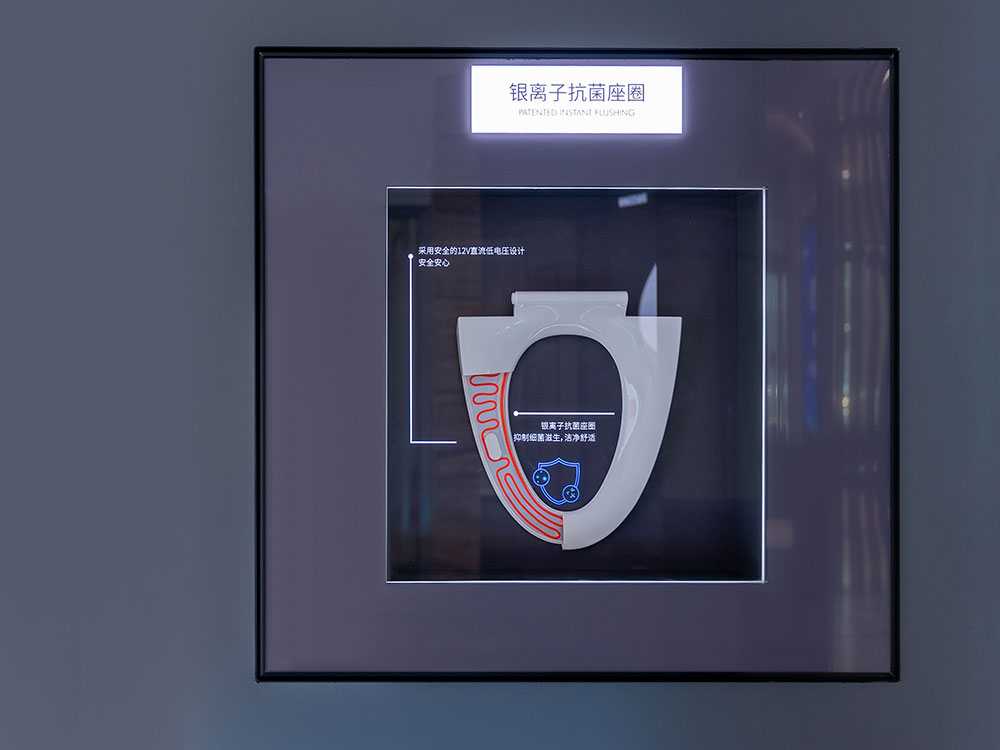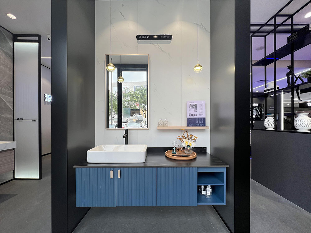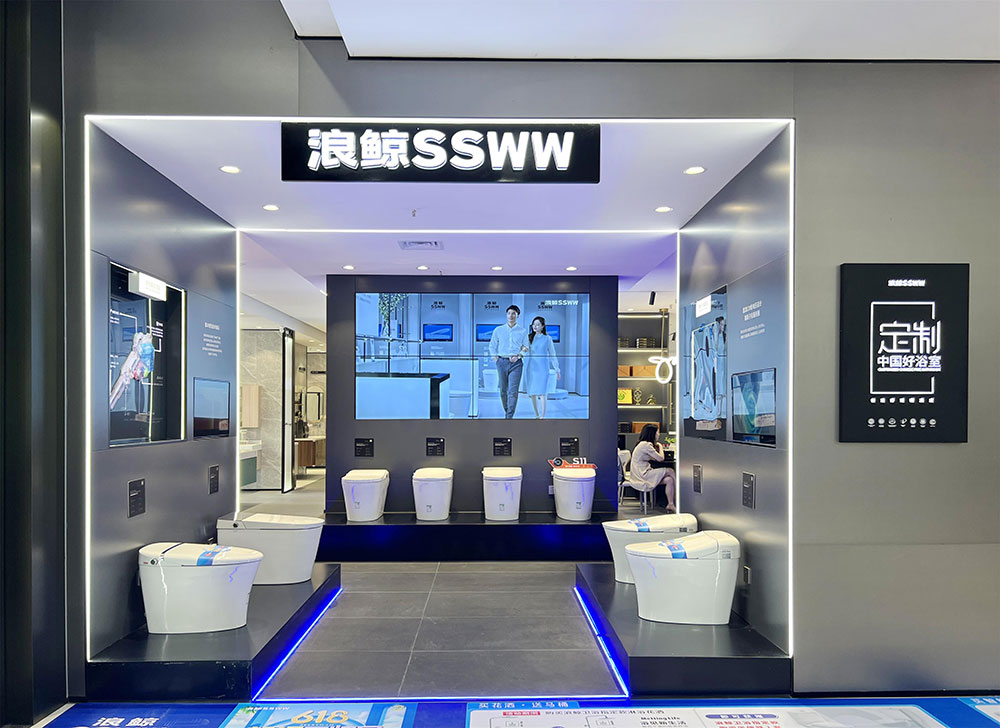 店内将乐鱼体育产品进行分区展示,智能区、五金区、浴室柜区等有序划分,产品款式多样,不同区域产品墙上也对应的将产品性能以画面或文字的形式进行阐述,既还原了产品的特性,又能很好的满足消费者的观赏与选品。