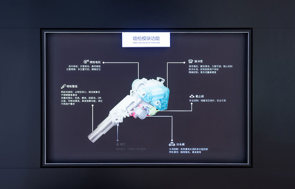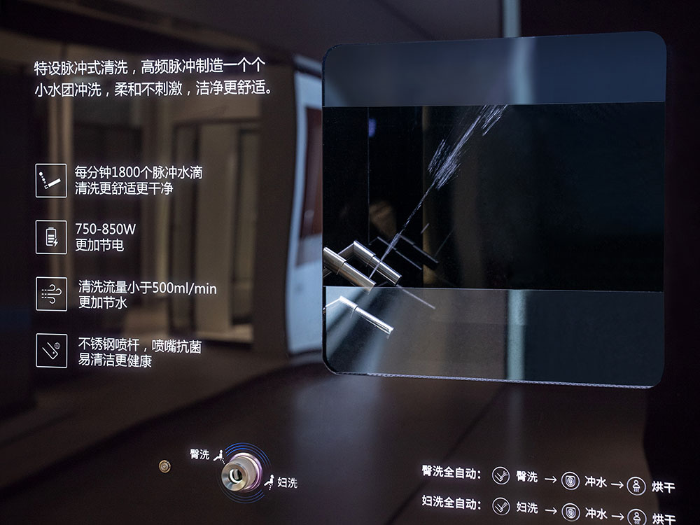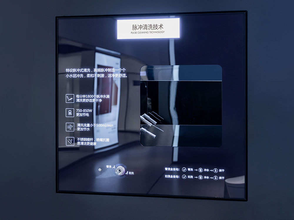 门店整体强调以细节突显产品质感,对产品的陈列既兼顾了卫浴产品的美观性,也将功能性一一展现。店内功能分区明确,各品类款式新颖,尺寸可选,从智能单品,到定制浴室柜产品,一应俱全。