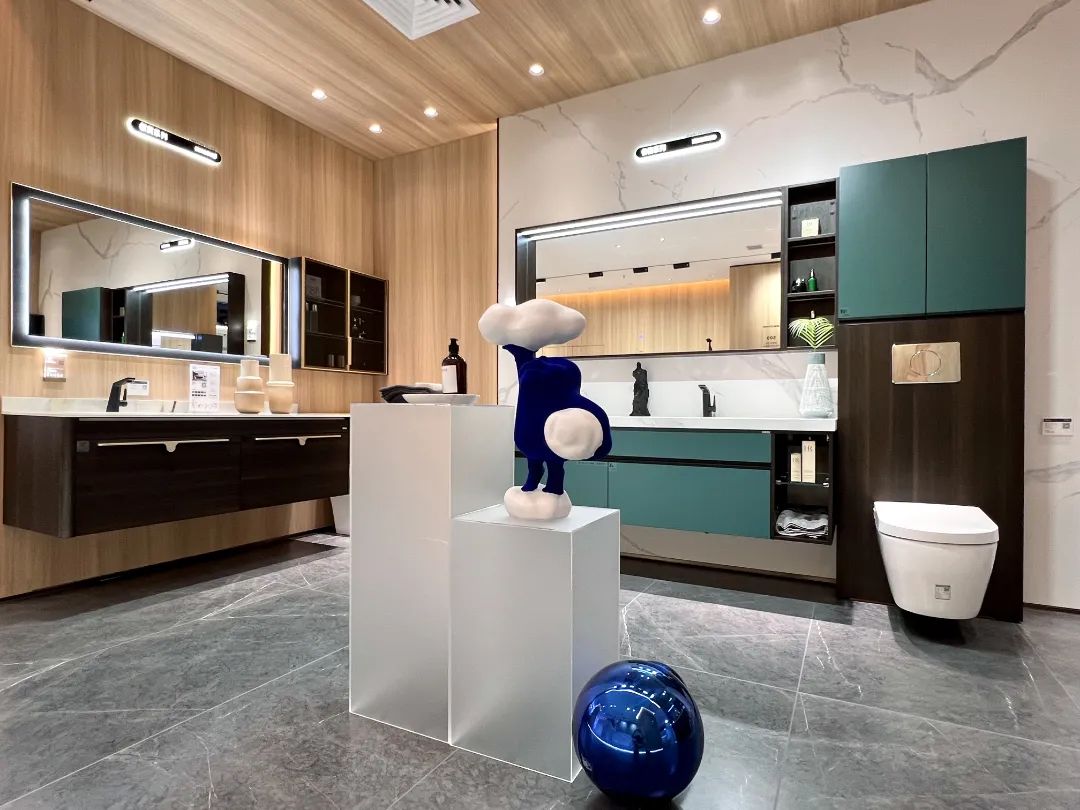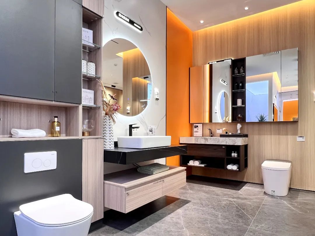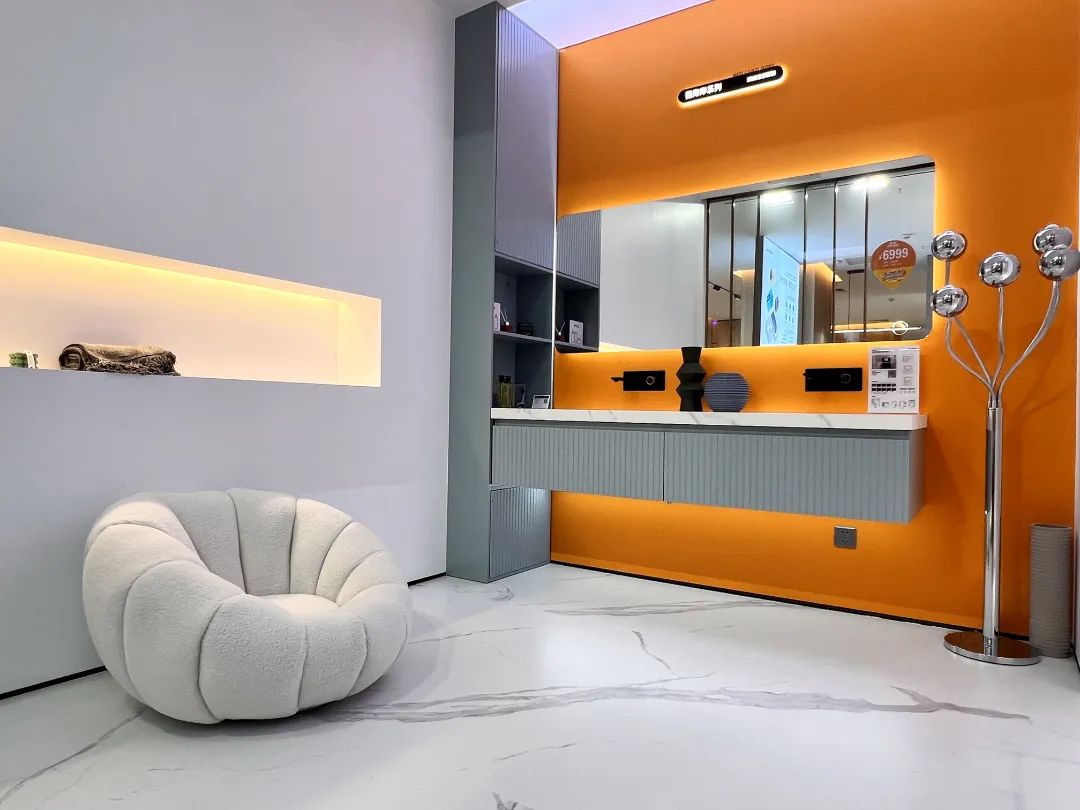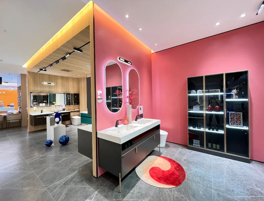 色彩的碰撞应用到产品与空间上,洗漱区+化妆区+如厕区+收纳区的大空间组合定制,让浴室空间具备更强的收纳功能与个性化的表达。