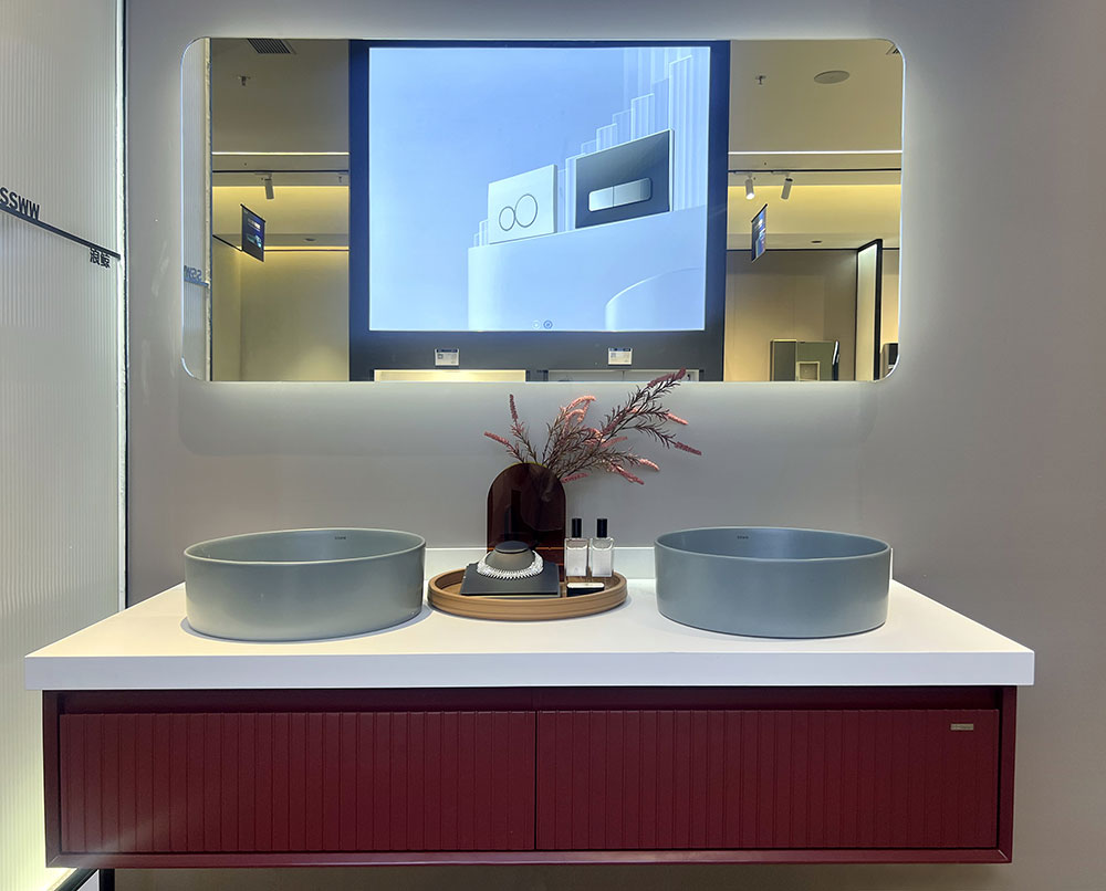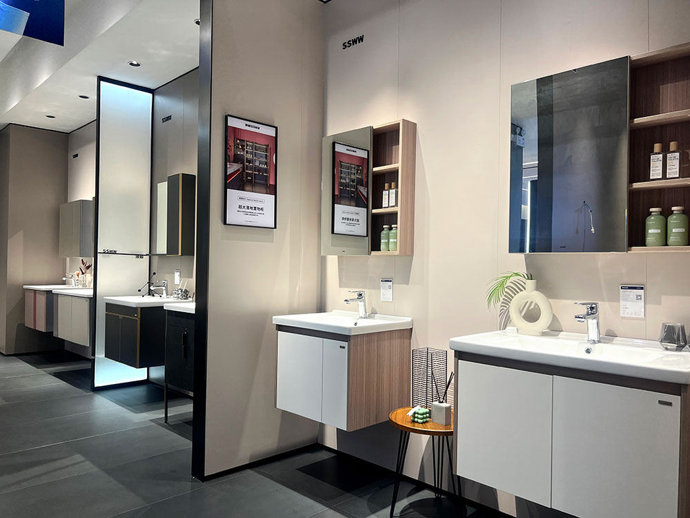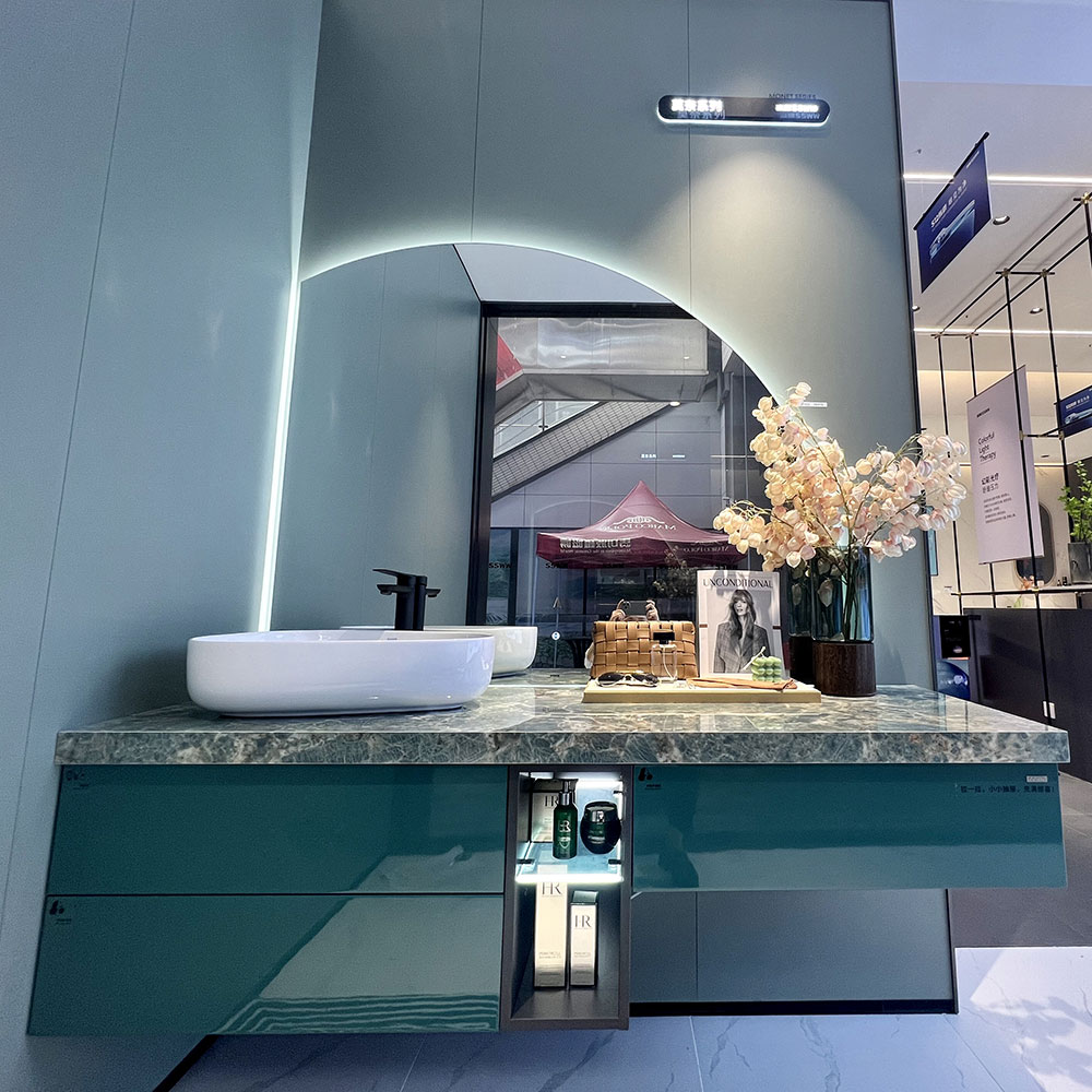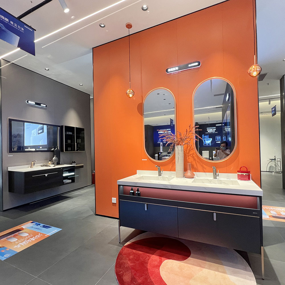 定制区域的产品展示也成为一大亮点之一。活力橙、祖母绿、复古红、孔雀蓝,以及充满森活气息的木纹系列定制浴室柜,富有记忆点的色彩极具冲击力。