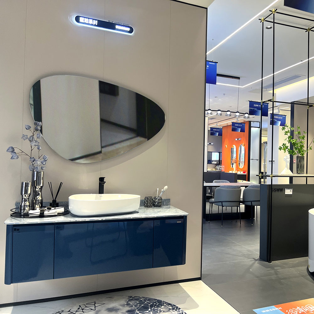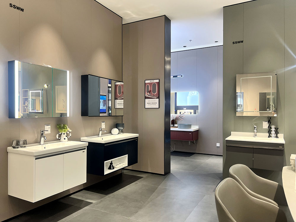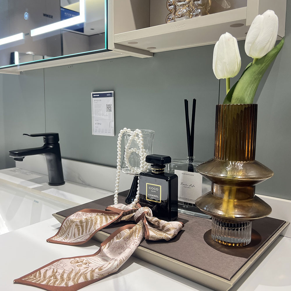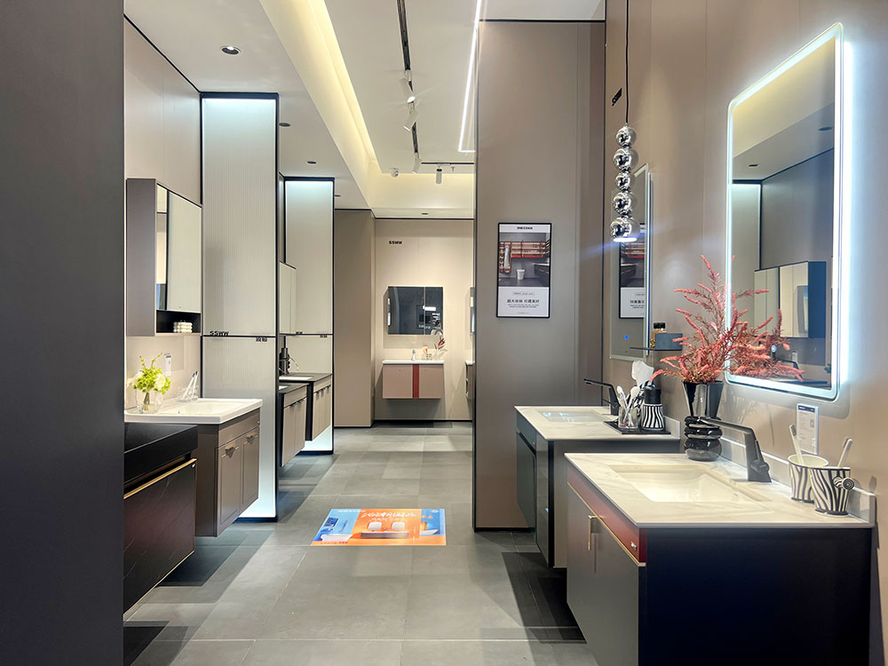 定制区域的产品展示也成为一大亮点之一。活力橙、祖母绿、复古红、孔雀蓝,以及充满森活气息的木纹系列定制浴室柜,富有记忆点的色彩极具冲击力。