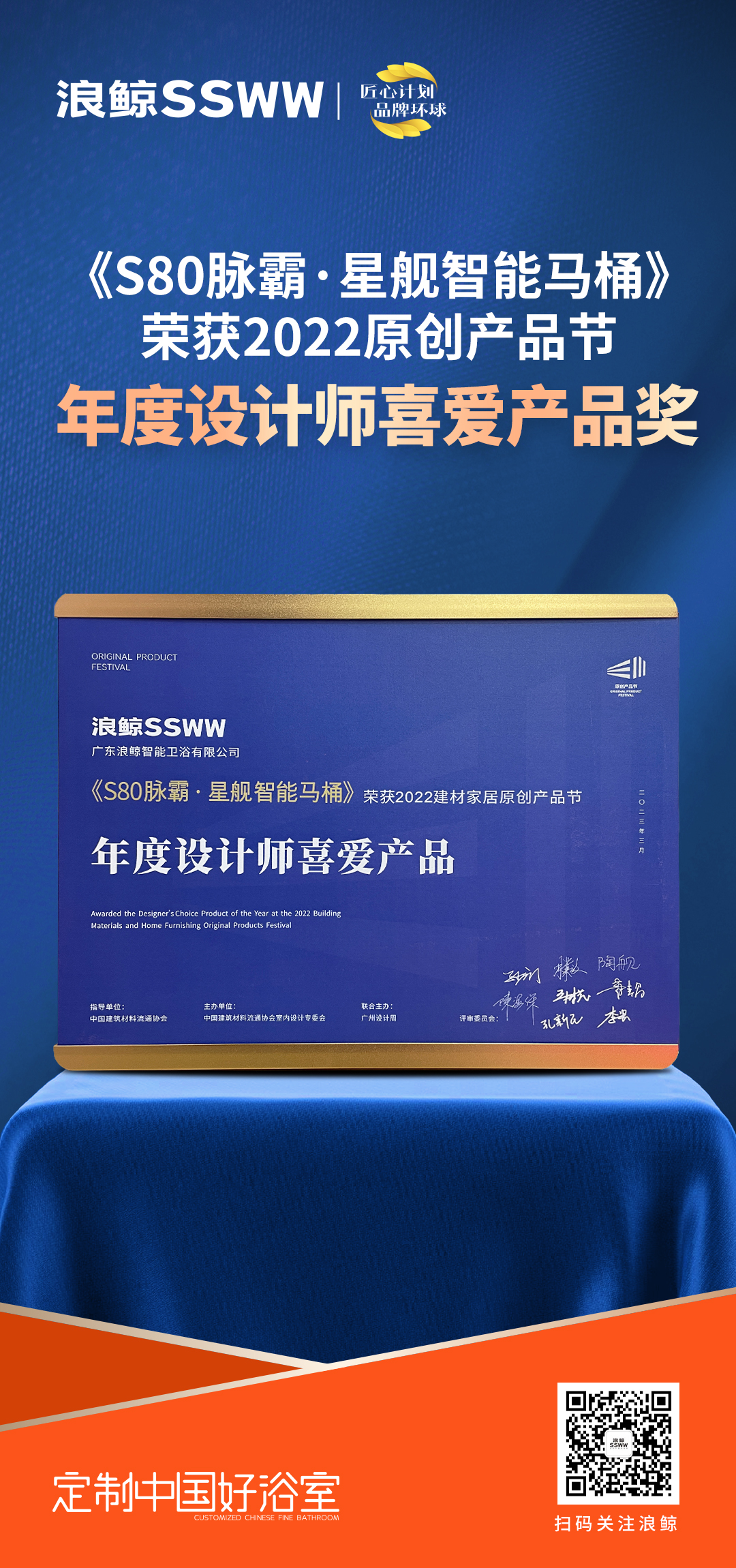 3月5日,2022中国建材家居原创产品节在广州国际采购中心11号馆论坛区举办。乐鱼体育下载app官网与众知名设计大咖、新锐设计师、泛家居头部企业经理人及原创设计品牌代表齐聚一堂,共襄盛举。大会上,浪鲸S80脉霸 · 星舰智能马桶凭借着瞩目吸睛的外观及行业领先技术荣获“年度设计师喜爱产品奖”,同时,乐鱼体育下载app官网品牌被授予协会“2023年度合作伙伴”牌匾。